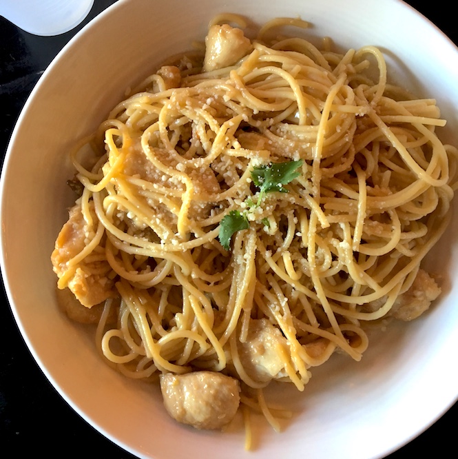 I ordered the Garlic Noodles with Chicken. Well, I suppose I could make this so why did I order this? Cause it’s garlic and I LOVE garlic. I don’t love the process of have to cook with garlic all the time so here’s my chance to just eat a dish with LOTS of it without the smell stained on your fingers. I’ll probably make this in the future though. Mmm…